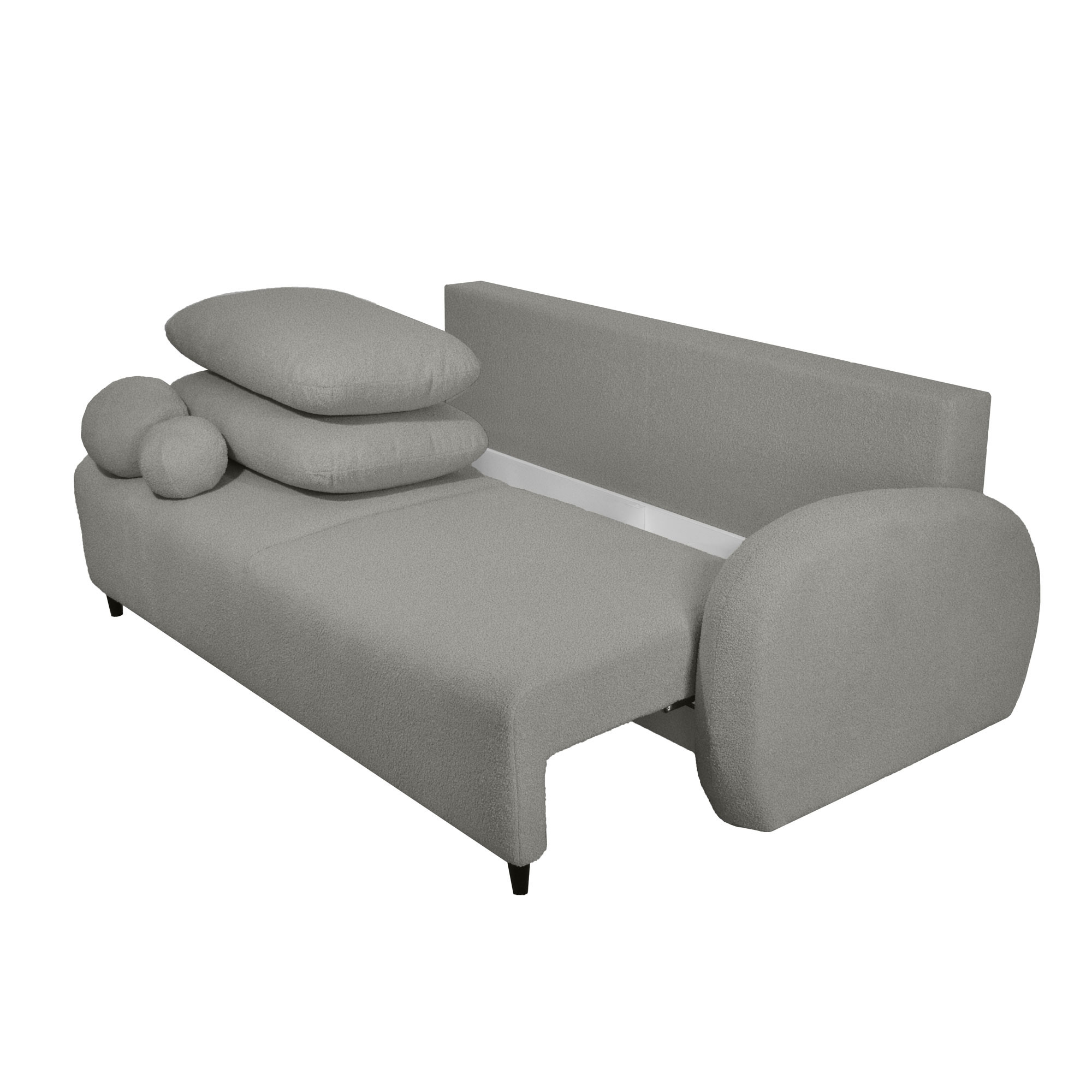 Canapeaua este extensibila si dispune de o lada de depozitare spatioasa. Extinderea se face simplu datorita mecanismului tip Z cu arc si bara de legatura, obtinand un spatiu de dormit de 190 x 140 cm. Cele doua perne mari si cele doua perne sferice incluse sporesc confortul zilnic.