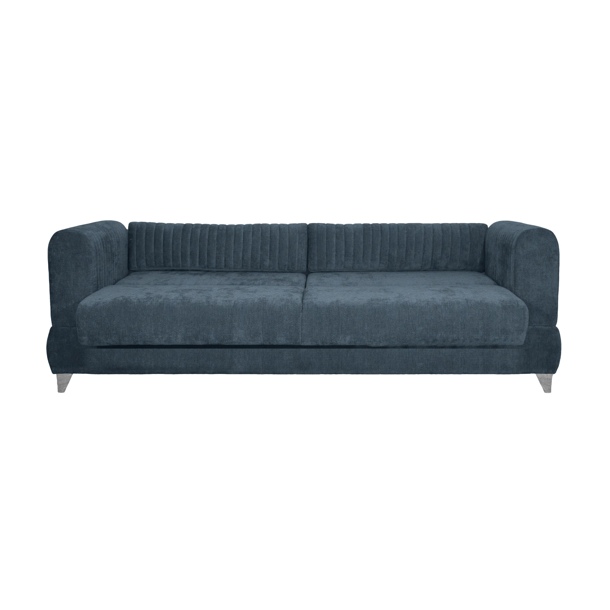 Structura este solida si bine echilibrata: cadrul de sezut si spatar este realizat din teava rectangulara de 20x20x1,5 mm, completat cu lamele curbate din fag, care sustin corect greutatea si ofera un sezut stabil. Umplutura este formata din burete, vata minet si chinga textila, combinatie care asigura confort constant si rezistenta in timp. Picioarele metalice cromate, cu inaltimea de 10 cm, ridica canapeaua de la sol si faciliteaza curatenia.