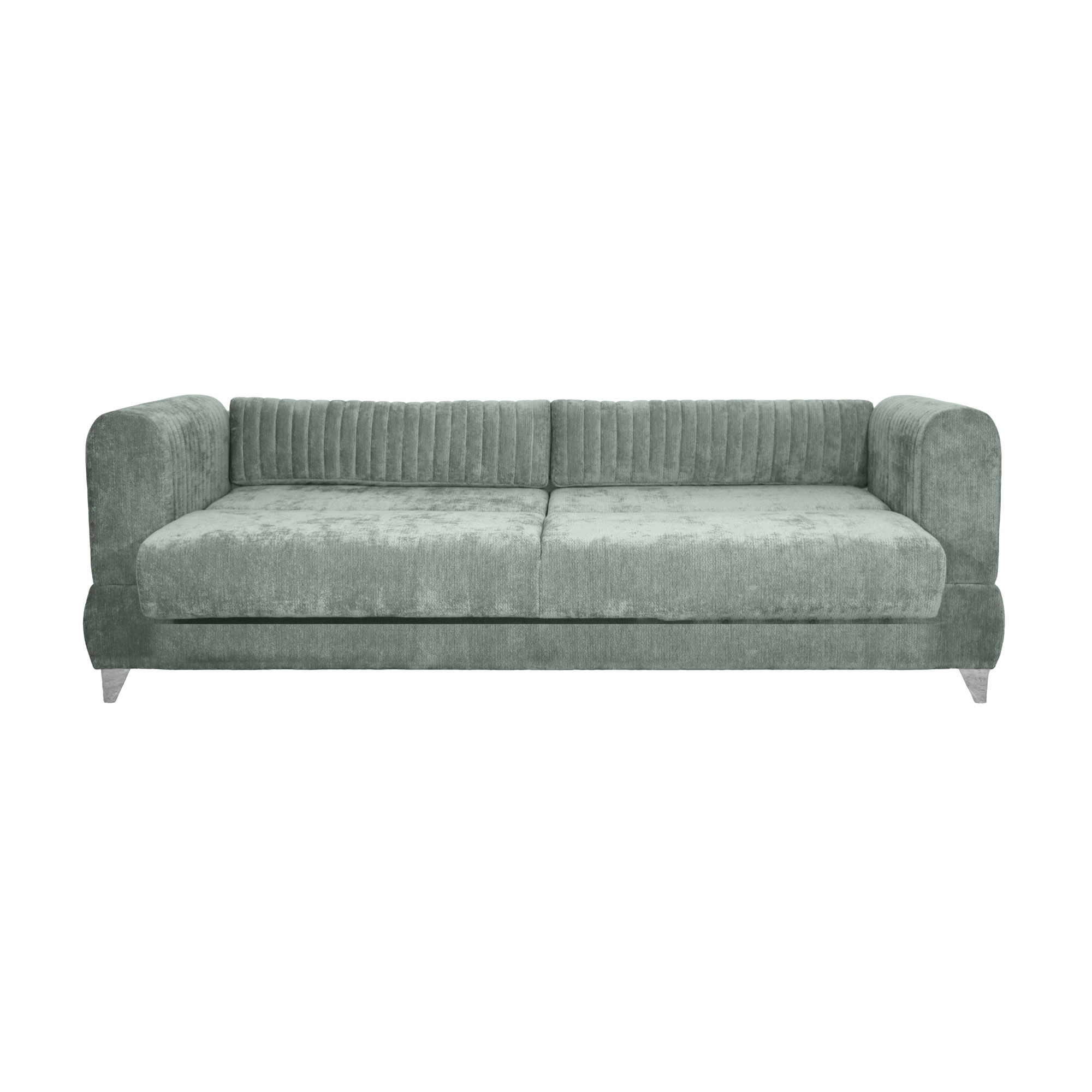 Structura este solida si bine echilibrata: cadrul de sezut si spatar este realizat din teava rectangulara de 20x20x1,5 mm, completat cu lamele curbate din fag, care sustin corect greutatea si ofera un sezut stabil. Umplutura este formata din burete, vata minet si chinga textila, combinatie care asigura confort constant si rezistenta in timp. Picioarele metalice cromate, cu inaltimea de 10 cm, ridica canapeaua de la sol si faciliteaza curatenia.